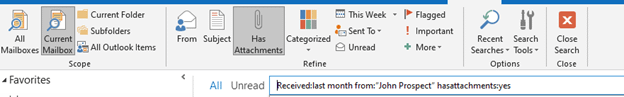 - I want to search in Outlook for the “email that I received last month from John Prospect that had an attachment”