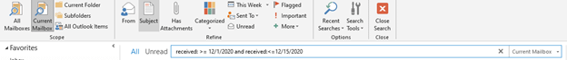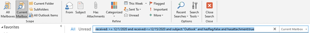 received: >= 12/1/2020 and received:<=12/15/2020 and subject:”Outlook” and hasflag:true and hasattachment:true