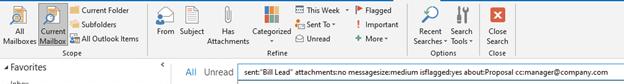 sent:”Bill Lead” attachments:no messagesize:medium isflagged:yes about:Proposal cc:manager@company.com